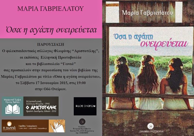 Ο Φιλεκπαιδευτικός Σύλλογος Φλώρινας “Ο Αριστοτέλης”, οι εκδόσεις Ελληνική Πρωτοβουλία και το βιβλιοπωλείο “Γωνιά” σας προσκαλούν στην παρουσίαση του νέου βιβλίου της Μαρίας Γαβριελάτου με τίτλο «Όσα η αγάπη ονειρεύεται», το Σάββατο 17 Ιανουαρίου 2015, στις 19:00 στην Οδό Ονείρων.